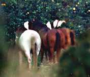 They have only five lumbar vertebrae. Most breeds of horse have six, Arabians have five and a half. The tails of Spanish horses are low set, and the Wild Horses of Abaco carry the same, low set tail. In addition, one of our mares carries her tail in a classic scorpion position when she runs. Unfortunately the video camera couldnt be brought into action in time to record this. We . . . saw a number of Paso Finos. They held their tails in an upward sickle shape, sort of like an Irish setter. The unusual tail carriage . . . is a highly desirable trait in Paso Finos. These quotes are from letters on page 43 of the Gaited Horse Magazine, winter 99, which featured a cover story on the Wild Horses of Abaco. |