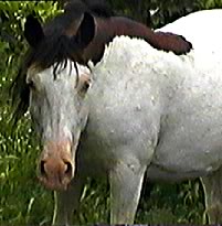 One of our older mares, Adhara (mother of Bellatrix II) began to limp in January. We try to not intervene more than necessary, but by April she wasn't any better. Dr. Robert Allen, DVM, was flown in from Freeport to assess the sitaution and to treat her. Xylazine tranqulizer was delivered by blowpipe and Adhara stood quietly while her forefeet were exmined. An attack of thrush was clearing up in her right hoof.