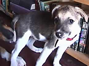 Wrecker (far left) is trying to grab Bucky's tail. This kind of play helps socialize some of the dogs who stay with us while they are recovering from their spay and neuter operations. Manyof these dogs are shy and afraid of people. The new dogs learn that they can have fun and play and in a few days they get used to having people around. |