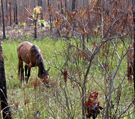 The horses hardly ever graze in the marshes. Shortly after the fires died, new grass sprang up in the marshes and the horses were quick to enjoy the sprouts before they became too tough. Its good to note that the horses have been spending less time in the mini pastures now that the forest growth is regenerating. They spend hours ranging up and down the preserve, snacking on whatever they fancy, including left over fire dried poison wood. |