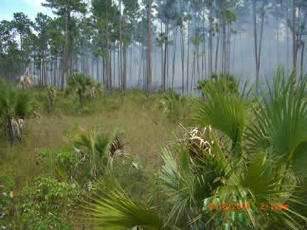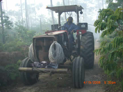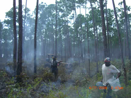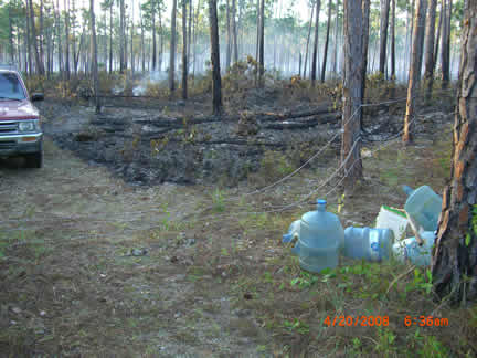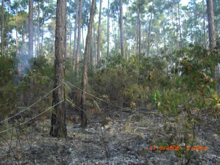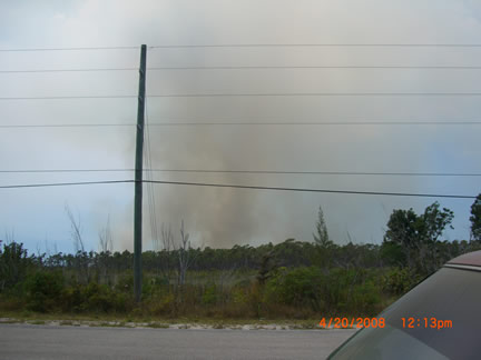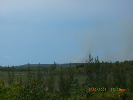 A Sweet Thursday it was not, though it started out gently enough. Foreknowledge of what was to come likely would not have helped much, what came was so bad. A video crew was anticipated, (they didn't arrive until Saturday). That freed up some time after chores and checking the horses and searching part of the big swamp for invasives. The swamp terrain is as bad as the bush, with the added fillip that sometimes its not possible to tell how deep the water really is. So I thought take a walk to the farms edge since the view is so pretty. At the ridge I looked south and saw a huge smoke cloud. A racing trip with the truck to the south end of the Preserve showed almost all of the two mile by half mile field across the south end of the Preserve engulfed. This is where the three stallions still at large live and I can only pray that Achernar, with the damaged lungs, has been able to stay up wind of the smoke. Who knows how much there will be left for them to eat?. And while part of our fence line had turned the fire away from the immediate Preserve, (we found extensive damage later) the stallion area was ablaze. We fought for six hours to turn the front to the new fire break road. Though the tractor hauled water that I pumped and the men hauled in five gallon jugs (40 lbs each), we just couldnt get enough on the front and it kept breaking out again. We burned out an expensive 12v pump, fortunately we had a back up. Still, it was useless. Imagine carrying 40 lbs. of water in a back pack sprayer over the broken, sometimes still hot rocks, vines pulling at every step, the rig snagging on vines, reaching through poison wood to snuff one last flame, falling down, not knowing how one got up, feeling optimistic only to turn a corner and see the front stretching away again. And the men did this carrying two jugs apiece. Jean fearlessly drove the tractor over freshly burned ground to bring water and to scout. To no avail. The only thing in our favor is the wind pushing against the fire, and hope for a deep dew. Perhaps in the morning well be able to stop it before it flares again.On our way to check the truck at the other end of the front we crossed the bottom of the preserve along the field edge. We found probably a quarter mile of fence destroyed. There was simply no time to be terrified on this wild ride through the still smoking bush, except in retrospect as the Messy Fergusson plowed through dust, cinders, smoke, lurching into potholes leaping over logs (as all the horrifying illustrations in the operator manual flashed in my mind-- avoid steep hills, sharp turns, etc.). No cushion on top of the steel fender, sitting cross legged provided a bit of spring, hanging on to a rope thrown round the sheet steel sun roof and hiking out at the same time trying to not get my head smashed into the side of the sun roof as we did everything but Immelmans.After we gave up the fighting, we pulled fence in the stallion area. We have been trying so hard to get ahead with it, now we have gone a long way backwards. We pulled several thousand feet of double fence line. Jean hauled, I coiled. Not fun, bent double, trying to kept the rope straight. I tried a pull, couldnt do it, and Im used to hauling up 50 lbs. of anchor. It did get easier toward the end, but I dont know how Jean and Avener did it. By the tine we staggered back to the base, the moon was well up and it was a small pleasure to see the solar powered lights and butterflies glowing at the compound to welcome us. It is way too late so Im spending the night, will sleep in the car after I calm down some, though this may be difficult with night birds shrieking at random and the dogs going off at the moon at least and who knows what else. And I havent mentioned yet the rage; deep, unadulterated rage against whomever set this thing off. Who pays us for the mens overtime? Who pays us for whatever physical damage our bodies have incurred? Who pays for the fence that needs to be replaced, the fuel used in truck and tractor. Who replaces the forage that keeps the horses alive? Who pays if we lose Achernar? Our donors, thats who, the people who are trying to help us keep the horses alive, not the people responsible. They accept no responsibility, and no one demands it of them. Instead we have to deal (yet again) with the horrific results of other peoples stupidity and greed: setting illegal fires (during a dry period with 25 k winds) for illegal plantings by residents of a slum that shouldnt even exist any more. Friday, April 18, blew by and was too tired to write. However, after fighting for four or five hours to contain the thing it was obvious that we still could not deal with a half mile long front moving up the stallion area. The men continued to haul the water jugs but we could not stop it. On area would be doused, it would pop out somewhere else. More fence was pulled and the plan was made to drop back to a road about half way across the preserve. This was one of two that weve been able to get bull dozed. So, already tired, we weed whacked about a half mile of cross road to make a broad path between the new road and the old road. While it was hoped that this would contain the fire, even if it jumped the new road and destroyed a lot of forest, the immediate preserve would be OK. The day ended with a half mile dash with the back pack blower for final clearing of the cross road. In one day I used a week whacker, back pack sprayer, back pack blower and a machete, and pumped full and loaded at least two dozen five gallon jugs. Then unloaded them. I went back to MH. This was a 12 hour day. Non stop, no lunch, just swigs of water and juice and once in a while a snack bar. Tomorrow will tell us whether we will win or not.Saturday, April 19. The morning was slow. All we could do was sit and stare for hours as the wall of smoke and flame crept towards us. We had all the tools ready, all the water jugs filled. We had about a half mile wide front to watch at the north end 