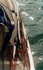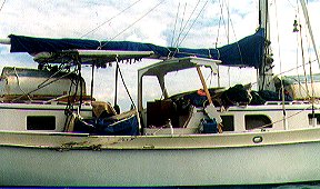 | After four months of neglect, supportive friends, a highly professional police force and a friend who is also an attorney finally prevailed on the perpetrator to make repairs. This resulted in ALNILAM spending two months tied to a high dock where her company lived like trolls under a bridge during the repairs. During this time Rehor took an active part in the reconstruction, sanding, painting, sewing new awnings, etc. Repairs were completed just days before departure back to the States. Some major hardware still has to be replaced, but a 'jury rig' is doing the job until the hardware can be found and installed. The return trip aross the Gulf Stream with a crew of one was relatively uneventful. |