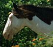 | Capella, a stallion, pinto with three distinct brown 'circles ' on his back. He has taken over Deneb, but allows Altair to remain close. |